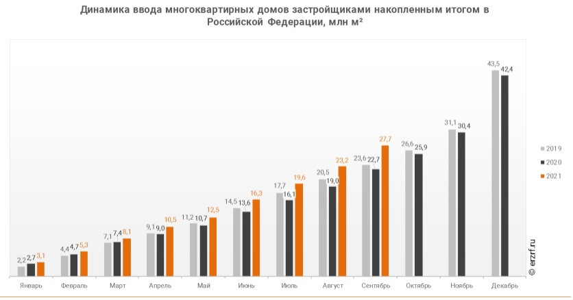 Несмотря, на то что строители многоквартирных домов тоже ставят рекорды. За январь-сентябрь 2021 года ввод многоквартирных домов застройщиками в России составил 27,7 млн м2, что на 22,1% или на 5,0 млн м2 больше аналогичного значения за тот же период 2020 года.