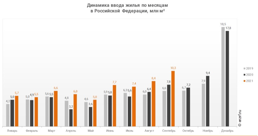 Также, есть несколько других значимых рекордов. Впервые, не в декабре-месяце строительство составило более 10 млн метров жилья в месяц. Для сравнения, вся Украина в 2020 году построила вдвое меньше, чем Россия в сентябре 21.
