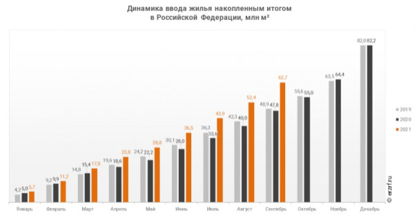 В январе-сентябре 2021 года в России введено 62,7 млн м2 жилья. Это на 31,2% или на 14,9 млн м2 больше, чем за аналогичный период 2020 года.
