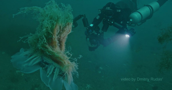 Видео получено недалеко от берега — именно в прибрежной полосе обычно фиксируются цианеи. Удачливым дайверам попалась сравнительно молодая особь, диаметр ее купола составляет около 70 см. Настоящими гигантами цианеи вырастают в арктических и антарктических широтах.