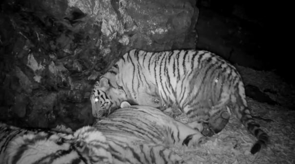 На кадрах, полученных научными сотрудниками «Земли леопарда», видно, что семейство краснокнижных кошек собралось на ночлег, укрывшись у скалы в лесу. Находясь под присмотром фотоловушки, тигрята осматривают территорию и дожидаются мать, которая, вероятно, возвращается с охоты.