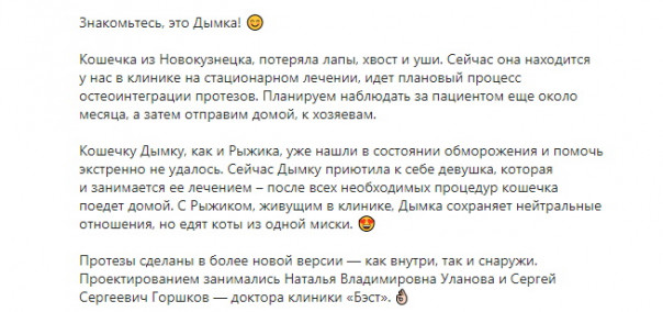 Сейчас ветеринары занимаются ее реабилитацией, предлагая за прогулки вкусную награду. Сергей Горшков отмечает, что небольшой вес и компактное телосложение – факторы, которые способствуют лучшей адаптации, и вскоре Моника даже сможет бегать.