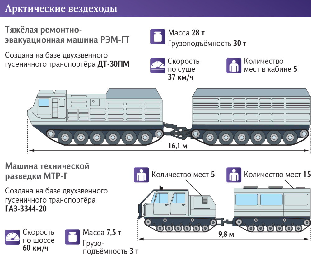 Главной «рабочей лошадкой» и основой арктических ремонтных отрядов станут тяжелые ремонтно-эвакуационные машины РЭМ-ГТ и машины технической разведки МТР-Г — в настоящее время они находятся в высокой степени готовности. В ближайшем будущем машины пройдут государственные испытания в арктических условиях. После этого будет определена организационно-штатная структура арктических подразделений.