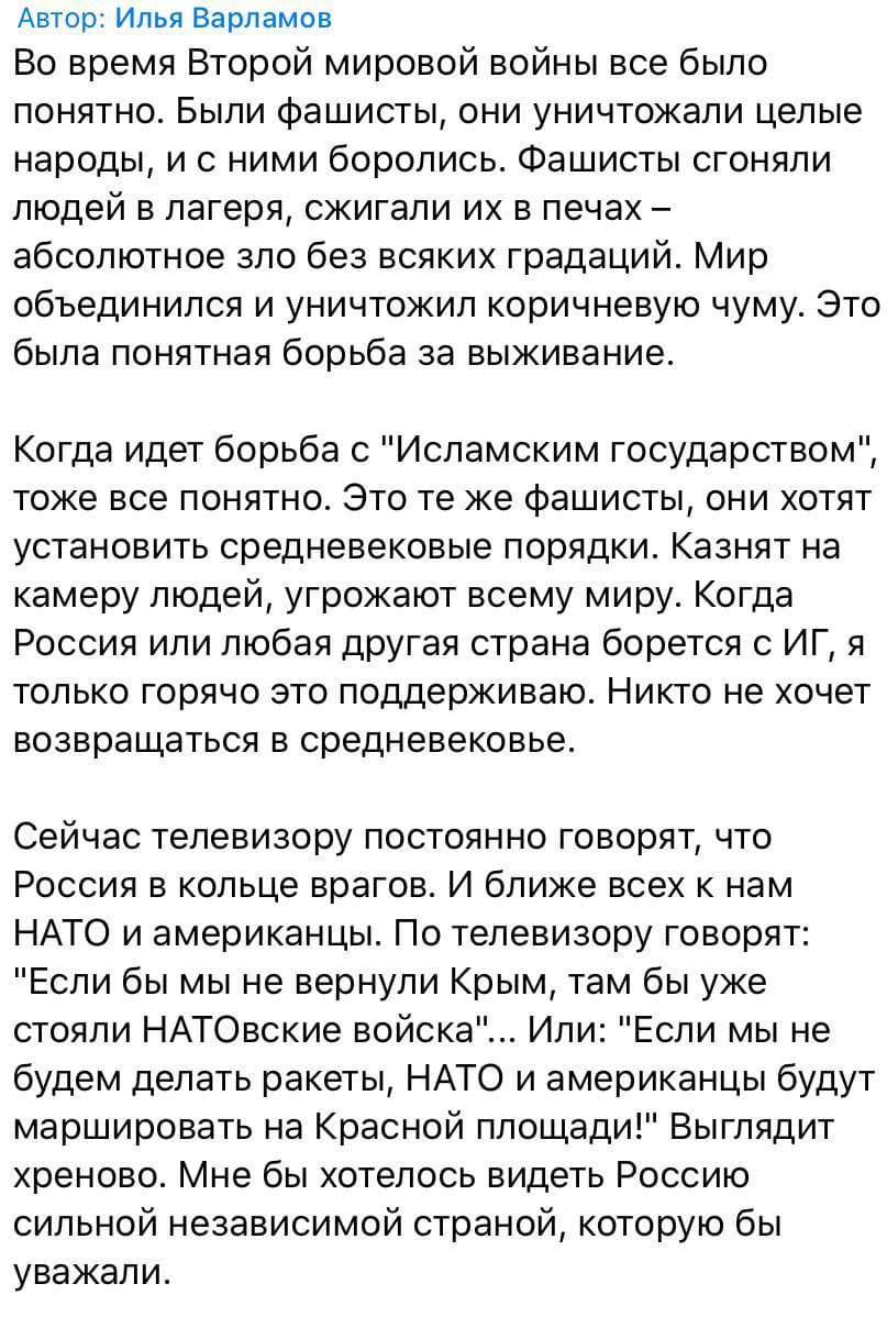Сидящий (говоря прямее - распиливающий) множество информационных госконтрактов и господрядов, российский (проукраинский) блогер Илья Варламов в открытую агитирует сдаваться США. Кстати, это не только его точка зрения, просто другие ее носители не столь глупы, чтобы публично писать об этом в телеграме.