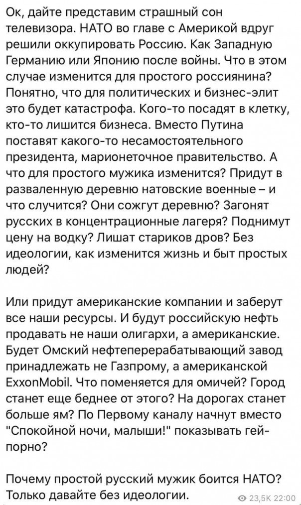 Или придут американские компании и заберут все наши ресурсы. И будут российскую нефть продавать не наши олигархи, а американские. Будет Омский нефтеперерабатывающий завод принадлежать не Газпрому, а американской ExxonMobil. Что поменяется для омичей? Город станет еще беднее от этого? На дорогах станет больше ям? По Первому каналу начнут вместо "Спокойной ночи, малыши!" показывать гей-порно? Почему простой русский мужик боится НАТО? Только давайте без идеологии."