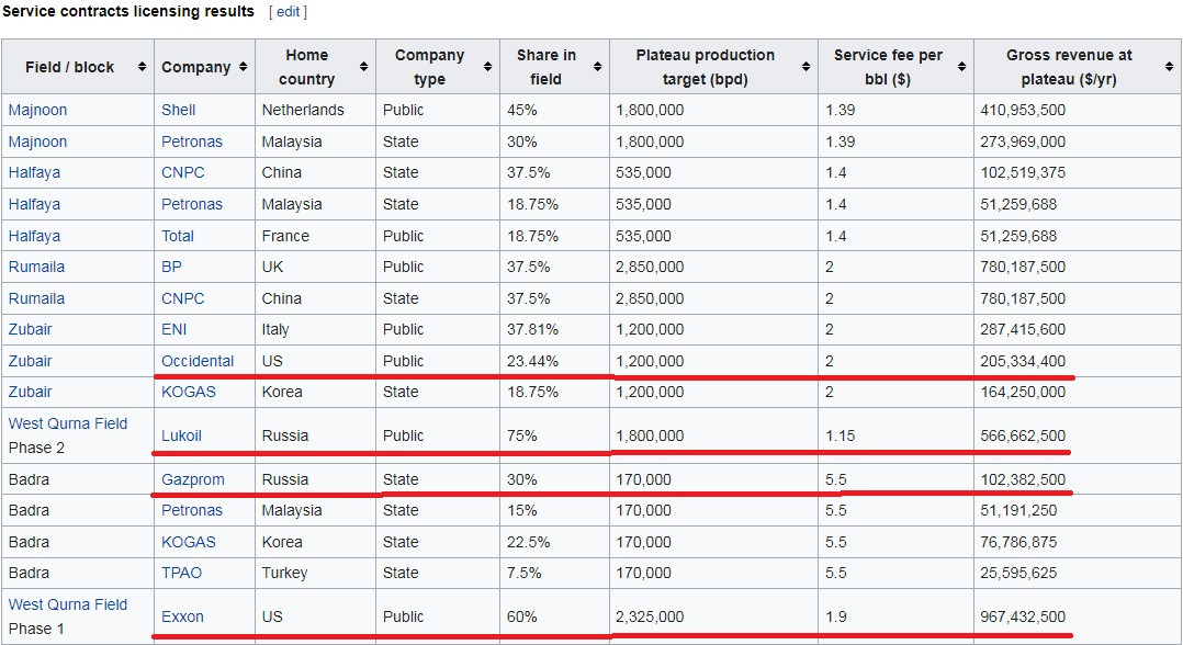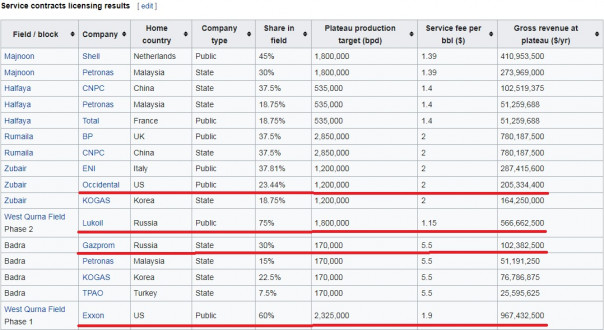Компании из России, страны которая в чудовищной 9-летней мясорубке в Ираке вообще не участвовала, получили в нефтяных активах Ирака кусок в половину (!) от того, что получили США, в обмен на 9 лет войны и сотни военных самолетов, груженых убитыми и ранеными. И это не считая кладбищ из тысяч ветеранов, покончивших с собою в США...