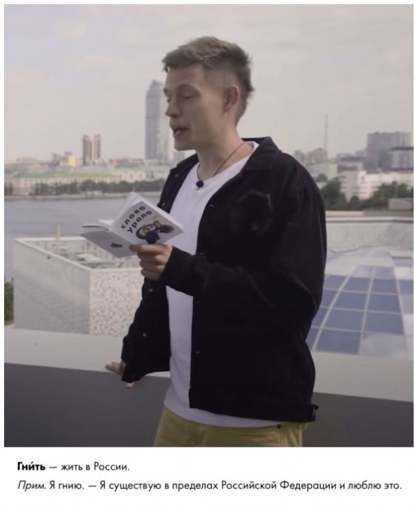 А вот известный либерал и русофоб Юрий Дудь (под 10 млн подписчиков на YouTube) рекламирует этот словарь. На данном скрине Дудь стоит на балконе Ельцин Центра в Екатеринбурге, вид в сторону Плотинки. Дудь тоже "гниет" и страдает в России, потому что деньги за такое западные кураторы платят только здесь.