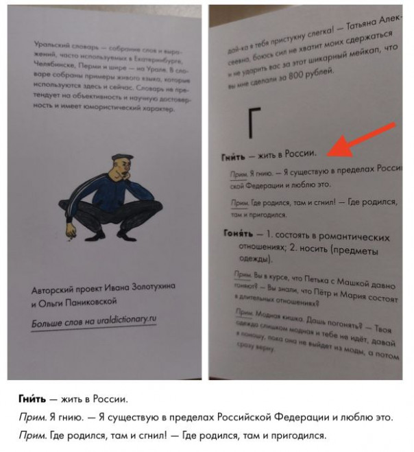 Гости города со всего мира могут ознакомиться с выражениями, цитирую: "часто используемыми в Екатеринбурге, Челябинске, Перми и по всему Уралу". Что характерно, прожив 43 года на Урале, такого выражения ни разу не слышал. "Гнить = Жить в России", ну разве не прекрасно?