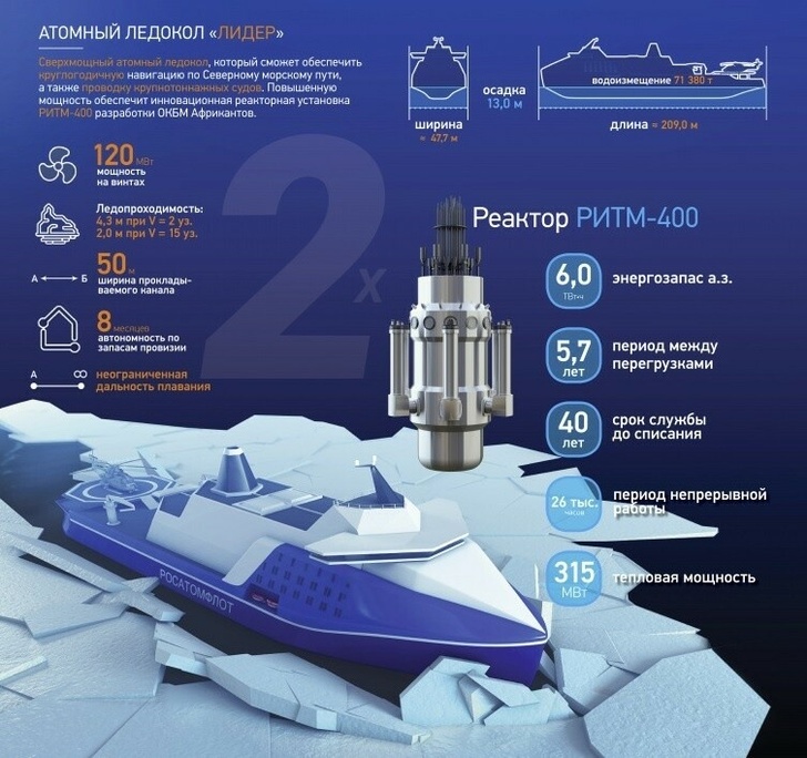 Реакторная установка «РИТМ-400» — это эволюционное развитие «РИТМ-200» с увеличением тепловой мощности до 315 МВт, что превосходит все имеющиеся судовые реакторные установки. При ее изготовлении будет применяться уже отработанная элементная база и технические решения. Комплектным поставщиком ядерной энергетической установки является АО «ОКБМ «Африкантов».