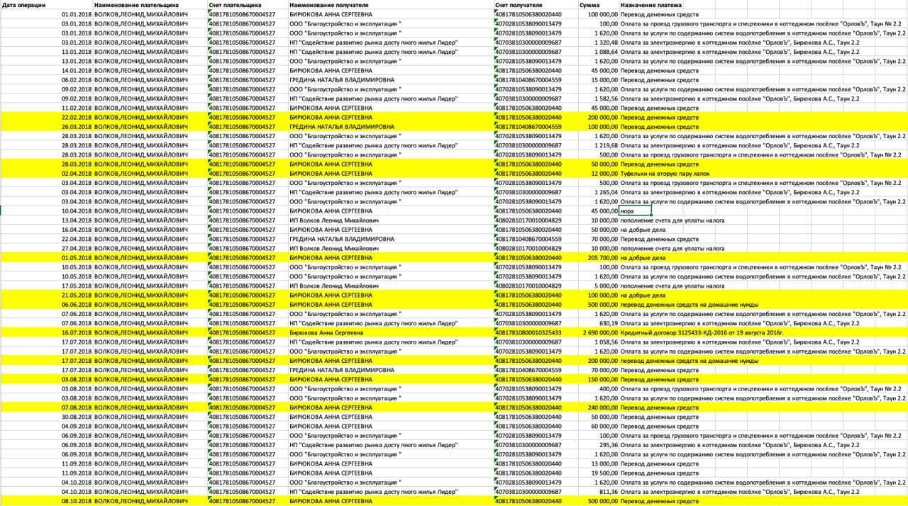 Переводы сотен тысяч рублей Бирюковой Анне — это нынешняя жена Волкова. Также переводы Грединой, поменьше – это экс-жена, заботливый Лёня не забывает бывшую)))