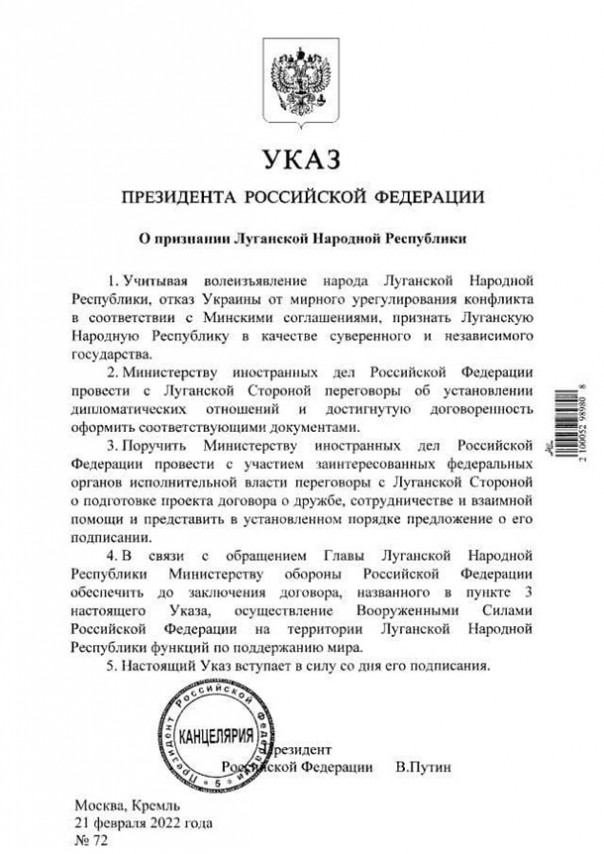 Срочно!!! Путин подписал указы о признании ДНР и ЛНР