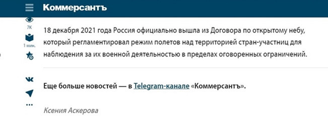 А теперь обратимся ко второму абзацу, где речь идёт о Договоре по открытому небу (ДОН). Для большей документальности и во избежание кривотолков приведём скриншот указанного фрагмента: