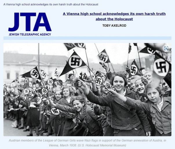 3. Публикация той же фотографии на сайте «Еврейского телеграфного агентства» с исторически достоверной подписью: «Австрийские члены Союза германских девушек размахивают нацистскими флагами в знак поддержки германской аннексии Австрии (Вена, март 1938 года).