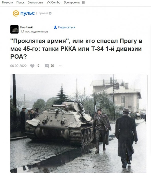 1. Общий вид главной страницы за утро 15 июня с.г. На самом «почетном» месте висит злопыхательская публикация под заголовком: «Проклятая армия, или кто спасал Прагу в мае 45-го: танки РККА или Т-34 1-й дивизии РОА?»