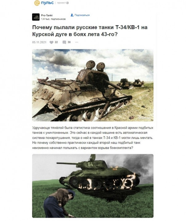 Кстати, пылающих немецких танков на главной странице этого «российского портала» я не видел уже много лет. Такое впечатление, что их и вовсе не было. Оно и понятно – по продвигаемой здесь версии русской и советской истории их и быть не могло. Ведь мы врага исключительно трупами закидывали.