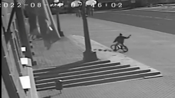 На опубликованной записи видно, как неизвестный в черной куртке подъехал на велосипеде к центральному входу здания администрации и бросил во входные двери бутылку с зажигательной смесью, но она не взорвалась. Тогда он кинул вторую, после чего спешно скрылся.