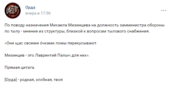 «Лично моё мнение: Мизинцев - интеллектуал и прекрасный логист, абсолютно знающий все нужды нашего родного МО. Должно все сдвинуться», - так новое назначение прокомментировал военкор ВГТРК Александр Сладков. Источник