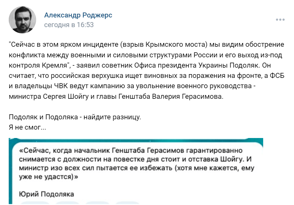 Сладков уже добредился фактически до «Москва сама взорвала мост по договорённости с хохлами». Делириум тременс – страшная штука. Чем «военкоры» по риторике нынче отличаются от бандеровской ЦИПСО? Непонятно.