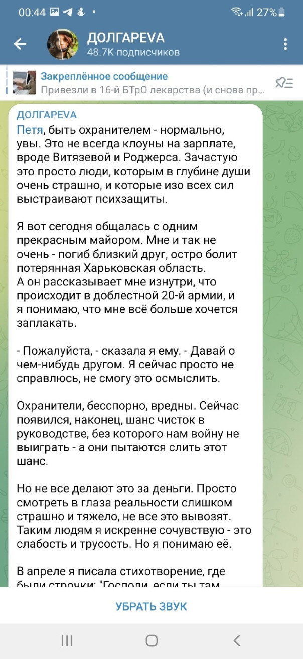В общем, оказывается, я не просто «охранитель», но ещё и «на зарплате». Пытался придумать, кто же мне платит в этот раз – не смог. Видимо, лично Путин, который страшно боится Аничку Долгареву.