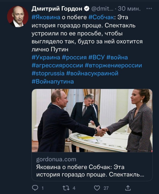Но каким боком к этой операции относится Ксения Анатольевна, которая, если верить ей (чисто теоретически), всего лишь представитель свободной прессы, каковой (опять-таки если верить К. Собчак) в РФ почти не осталось?