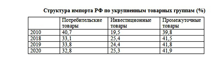 Кстати, в приведенной таблице мы также видим, что в период 2010—2020 гг. увеличивалась доля инвестиционных товаров в импорте России. Она выросла на 5,8 процентных пункта, инвестиционные товары стали занимать четверть всего российского импорта.