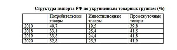 Как видим, за период 2010—2020 гг. доля потребительских товаров в российском импорте сократилась почти на 8 процентных пунктов. Наверное, это стало результатом развернувшейся с 2014 года кампании импортозамещения. Но вместо импортного товара российскому потребителю стали предлагать продукцию «локализованного производства». «Промежуточные товары», представленные в таблице, — комплектующие (агрегаты, узлы, детали) для «локализованных производств». Подавляющая часть промежуточной продукции поступала (и продолжает поступать) на предприятия обрабатывающей промышленности.