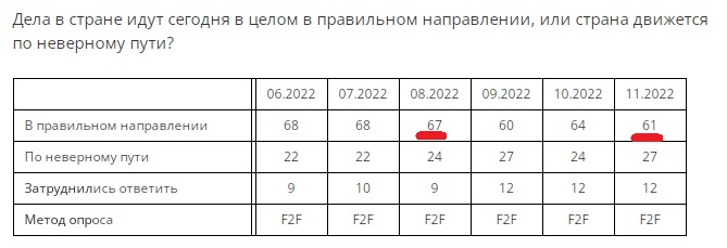 Снижение доли одобряющих работу президента на 4 п.п. за 3 месяца. Причем за ноябрь вообще не снизилось ("Народ не Простит Сдачи РусскАгА Херсона!"). И опять-таки: реально на негатив перешли лишь те же 3%.