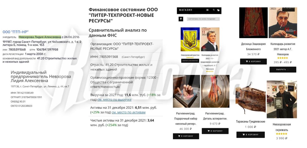 Как удалось выяснить Readovka, Лидия Алексеевна Невзорова владеет несколькими бизнесами в Питере и в области: интернет-магазином от имени мужа, книгами на «ЛитРес» его же авторства и многим другим. Также Невзорова имеет долю в питерской строительной компании ООО «ПТП-НР». Отметим, что бизнесы Невзорова — действующие, дела ведет его жена, на которую зарегистрированы абсолютно все ИП.