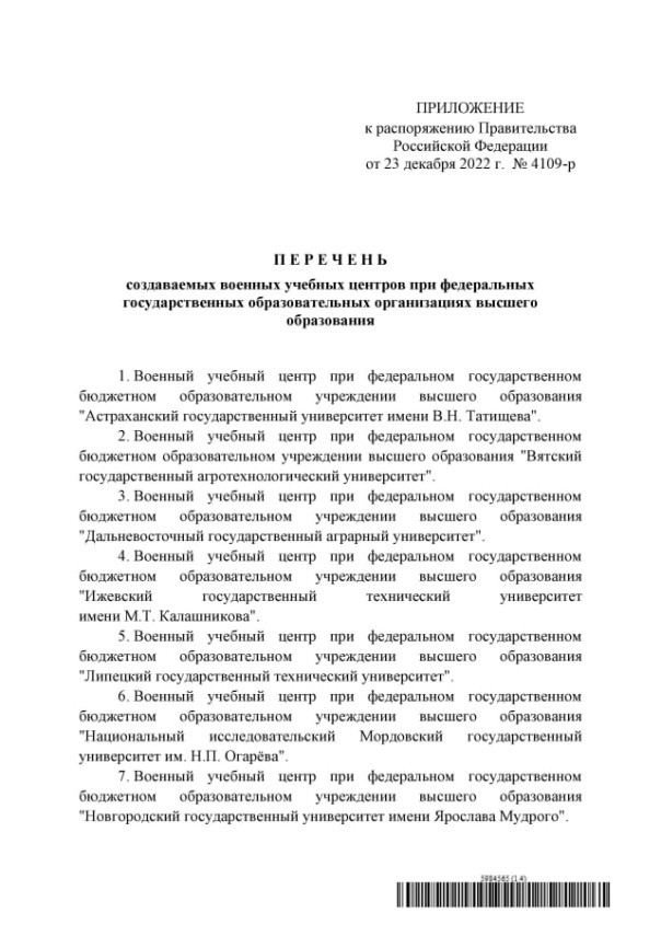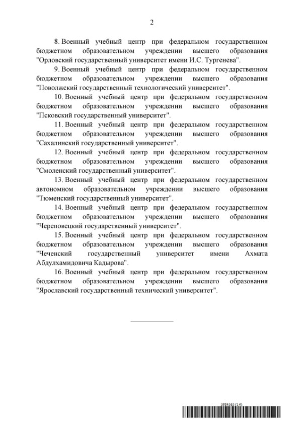 В перечень создаваемых военных учебных центров вошли: Ижевский технический университет имени Калашникова, Чеченский госуниверситет имени Ахмата Кадырова, Псковский госуниверситет.