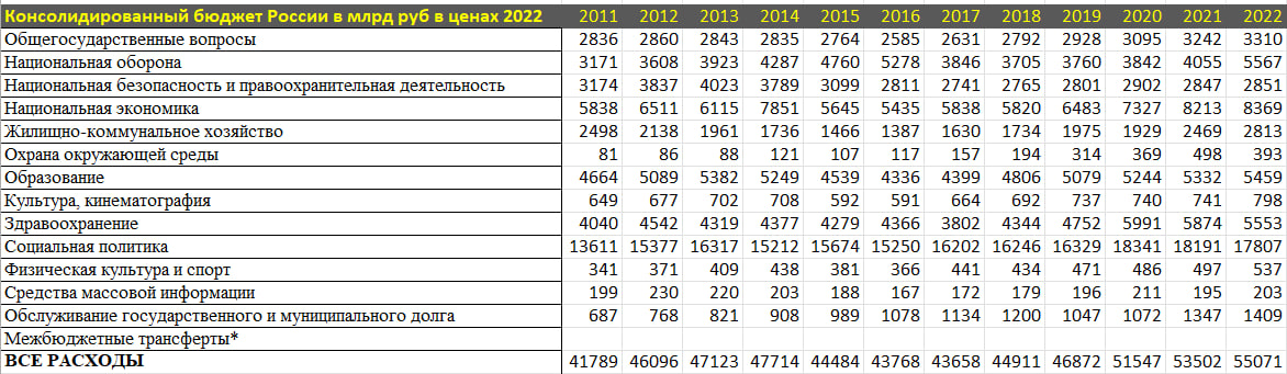 Для общей картины лучше всего брать за основу консолидированный бюджет России (федеральные расходы + региональные (субъекты РФ) расходы + внебюджетные фонды) за исключением межбюджетных трансфертов, т.к. сальдо равно нулю.