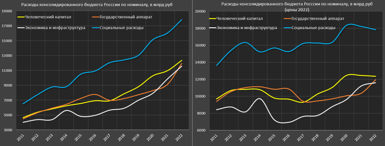Акцент государства на экономике и инфраструктуре выступил одним из основных стабилизирующих факторов, позволяющим вывести экономику из затяжной стагнации 2013-2017, и спасти от обрушения в 2020 и 2022.