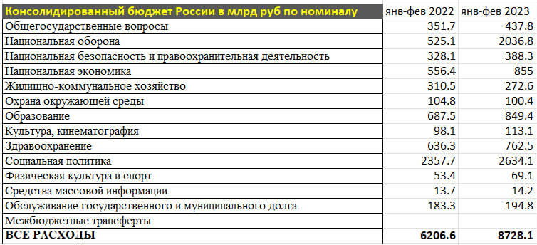 За январь-февраль 2022 оборонные расходы были лишь на пятом месте по объему распределенных средств, занимая долю 8.5% в общих расходах, а в 2023 оборонные расходы на втором месте сразу после социальной политики, занимая долю 23.3%!
