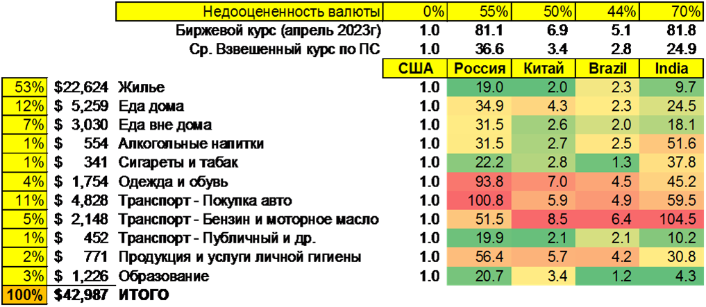 Возвращаясь к реальной стоимости валют по ППС, как видно из Таблицы №1 две категории товаров, по которым Россия находится в очень слабом состоянии -- это автомобили и одежда-обувь. По этим двум категориям стоимость рубля не только не недооценена, но и переоценена примерно на 16-24% (на момент анализа, то есть на апрель 2023 года).
