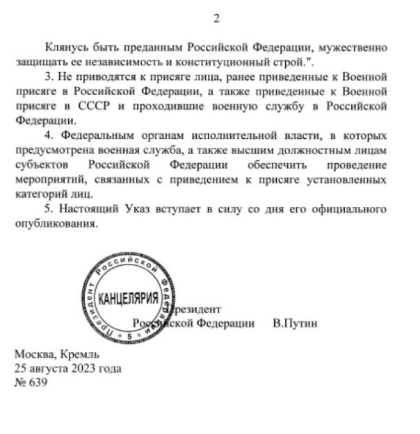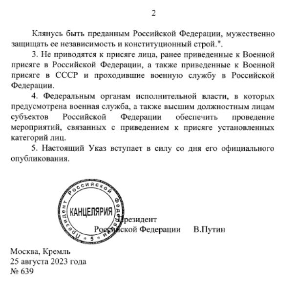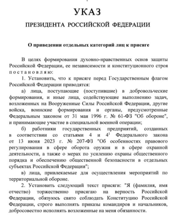 Вступил в силу указ о приведении к присяге перед Государственным флагом РФ поступающих в добровольческие формирования, бойцов теробороны, которые способствуют выполнению задач, стоящих перед ВС РФ и принимающих участие в спецоперации. Согласно указу, который подписал глава РФ Владимир Путин, к присяге приводятся работники охранных предприятий в новых регионах. Документ опубликован на официальном портале правовой информации.
