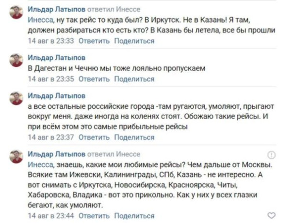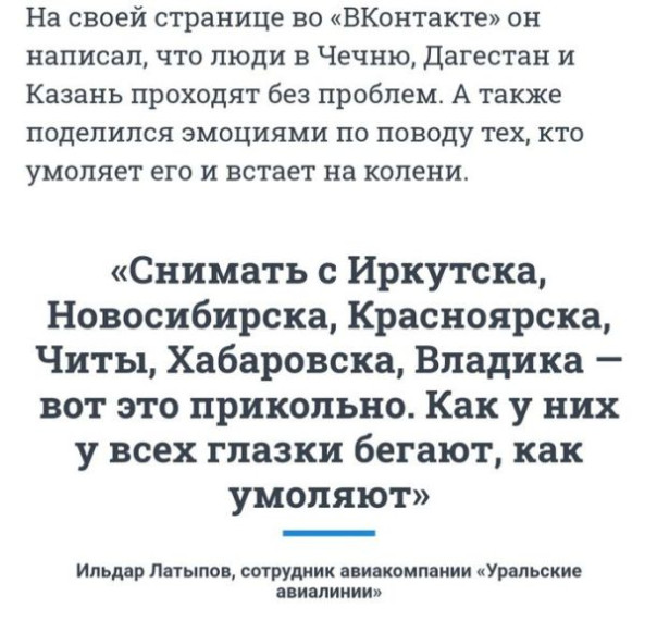Со СМИ Латыпов разговаривает дерзко и по-прежнему кошмарит людей, огласки не боится и издевается над жертвами в комментариях ВК. Возможно, тут все дело в поддержке такого поведения руководством компании «Уральские авиалинии».