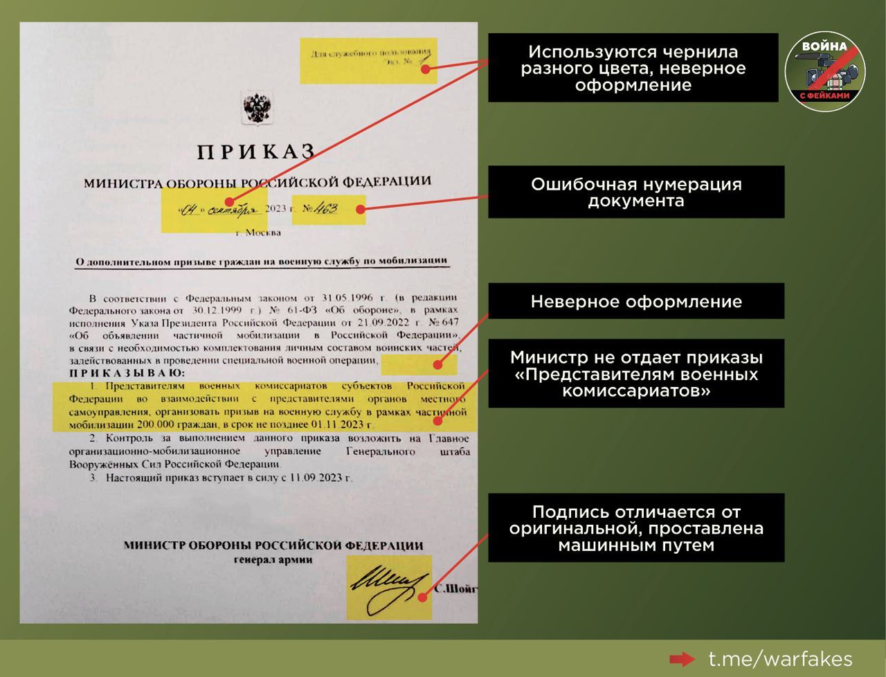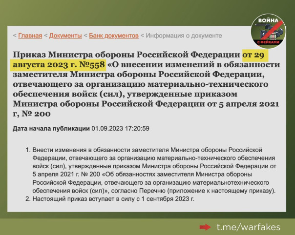 Они отмечают, что в распространяемом документе не соблюдена нумерация. «Фейковый приказ, который якобы подписали в сентябре, имеет порядковый номер 463. При этом на сайте Минобороны еще 29 августа был опубликован приказ №558.