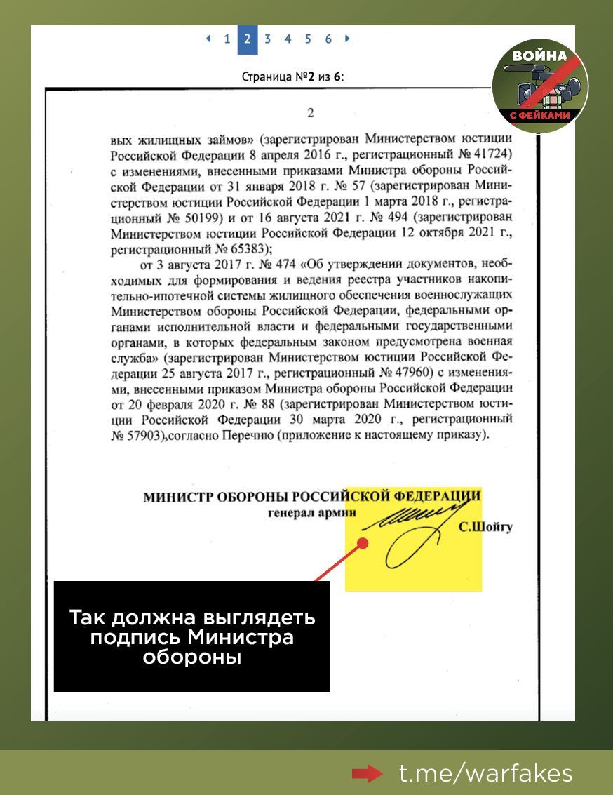 Кроме того, в фейковом документе подпись Шойгу сделана черной ручкой, а дата подписания документа и номер экземпляра – синей. Такое возможно, только если вместо оригинальной подписи министра использовали шаблон из другого документа. Более того, в свежих приказах подпись Шойгу выглядит по-другому, отмечают борцы с фейками.