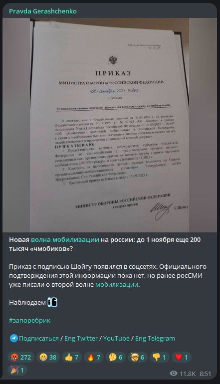 Украинские Telegram-каналы распространяют фейковый «приказ министра обороны» Сергея Шойгу, согласно которому с 11 сентября в России якобы возобновятся мобилизационные мероприятия. На деле, как сообщает Telegram «Война с фейками», распространяемый документ изготовил украинский Центр инфо-психологических операций ВСУ для дестабилизации ситуации в России.