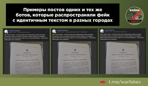 «Распространение началось с небольших каналов, после чего фейк подхватила вся Telegram-сетка украинских дезинформаторов, включая советника МВД Украины Геращенко и крупнейшие информагентства. Параллельно документ распространяли в соцсетях боты. На скриншотах видно, что в пабликах разных городов публиковался идентичный текст. Сейчас все подобные комментарии заблокированы», – указывают авторы Telegram-канала.