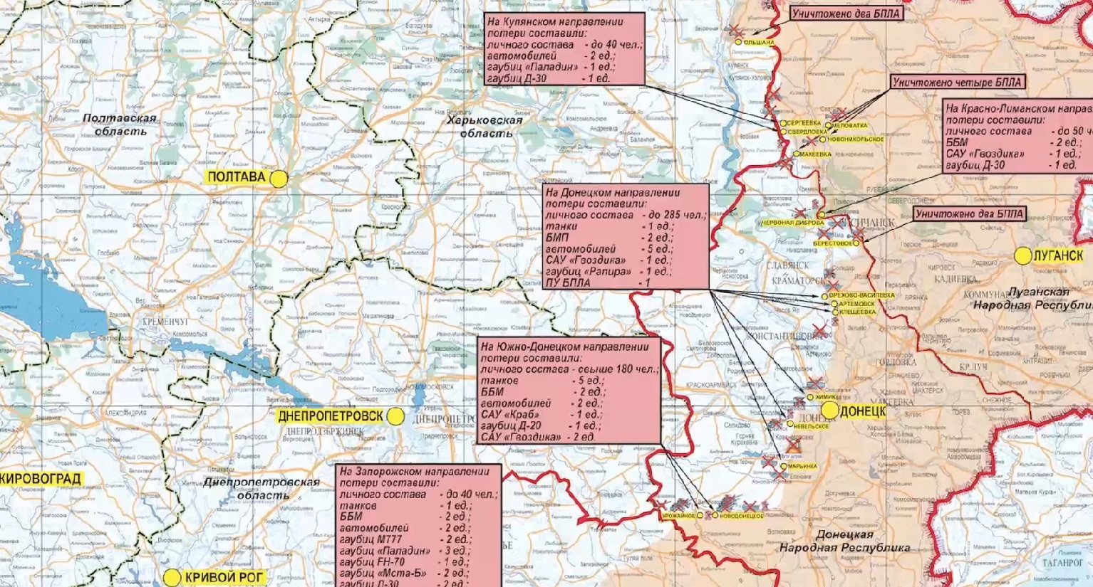 За сутки уничтожено до 40 украинских военнослужащих, танк, две боевые бронированные машины, два пикапа, две артиллерийские системы М777 производства США, три самоходных артиллерийских установки М109 «Paladin» производства США, орудие «FH-70» производства Великобритании, две гаубицы «Мста-Б», два орудия Д-30 и две самоходные артиллерийские установки «Гвоздика».