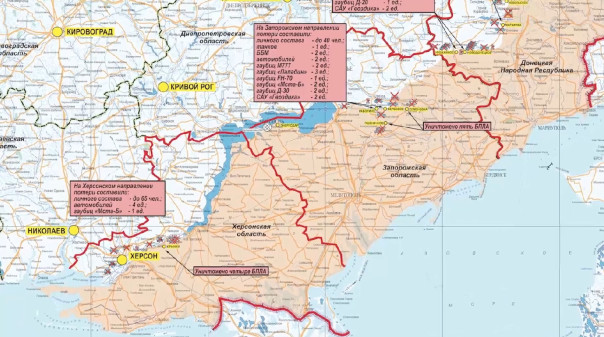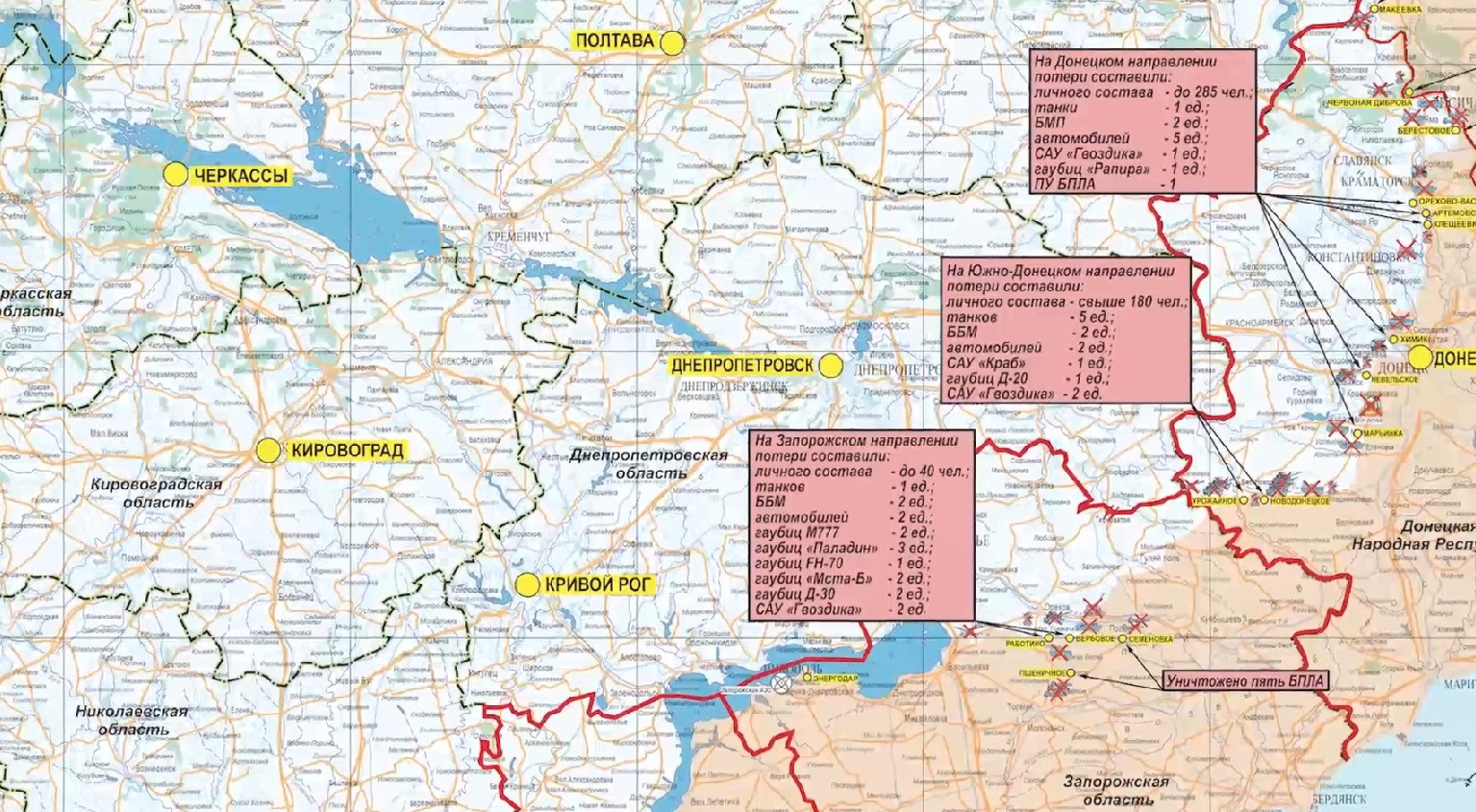 Кроме того, в районе города Артемовск Донецкой Народной Республики нанесено огневое поражение скоплениям живой силы и техники 17-й танковой бригады ВСУ. В ходе боев на данном направлении противник потерял до 285-ти украинских военнослужащих, танк, две боевые машины пехоты, пять автомобилей, самоходную артиллерийскую установку «Гвоздика», пушку «Рапира», а также пункт управления беспилотными летательными аппаратами.