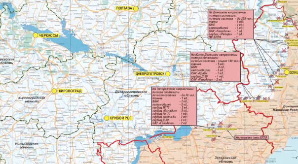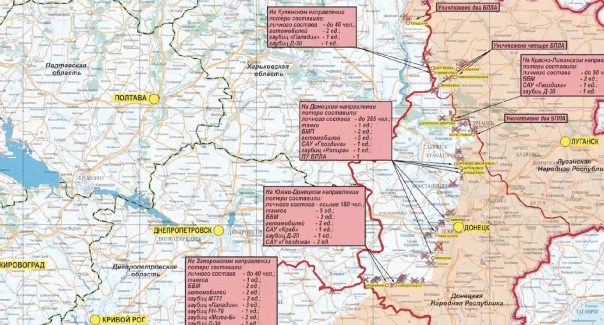 Кроме того, нанесено поражение скоплениям живой силы и военной техники противника в районах населенных пунктов Урожайное и Новодонецкое Донецкой Народной Республики. Потери противника на данном направлении составили свыше 180-ти украинских военнослужащих, пять танков, две боевые бронированные машины, два автомобиля, самоходная артиллерийская установка «Krab» польского производства, две самоходные гаубицы «Гвоздика», а также орудие Д-20.