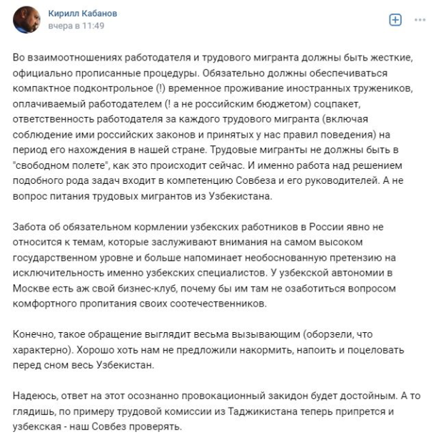 Недоумевает и председатель Национального антикоррупционного комитета Кирилл Кабанов, который справедливо указывает на то, что проблемами питания строителей должны заниматься компании-застройщики, а не бюджет России. Да и узбекский бизнес вполне может помочь своим соотечественникам