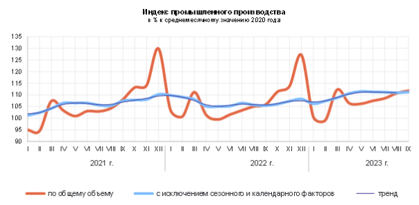 В сентябре 2023 года на рост индекса промышленного производства оказало влияние увеличение объемов производства в обрабатывающих отраслях, а также в отраслях, связанных с водоснабжением и водоотведением, утилизацией отходов и ликвидацией загрязнений.