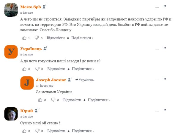 Комментаторы под материалом явно не очень довольны прочитанным и пишут, что им очень "сумно", западные партнёры "кынулы", а предприятий "нэзалэжного" военно-промышленного комплекса почему-то не видно, хотя в советские времена УССР имела колоссальный потенциал в этой сфере.