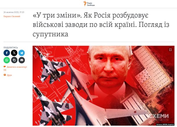 Анализ спутниковых снимков указывает на то, что Россия активно наращивает производственные мощности на своих военных заводах. Речь идет о предприятиях, которые производят и ремонтируют тактические и стратегические самолеты, боевые вертолеты, а также собирают военные дроны и управляемые боеприпасы. Именно на таких заводах "Схемы" увидели заметные изменения – спутник зафиксировал развитие ряда предприятий военного и двойного назначения, появление новых ангаров и цехов", пишут расследователи американской радиостанции.