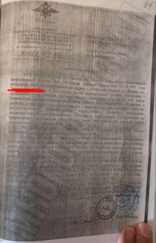 "Малхасян Аркадий Левонович причастен к ОПГ на территории Смоленской области. Данная группа осуществляет на территории региона деятельность связанную с вымогательствами и контрабандой через госграницу РФ. Сам же злоумышленник, в этой группировке пользуется большим авторитетом", - гласит документ.