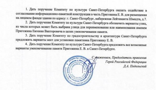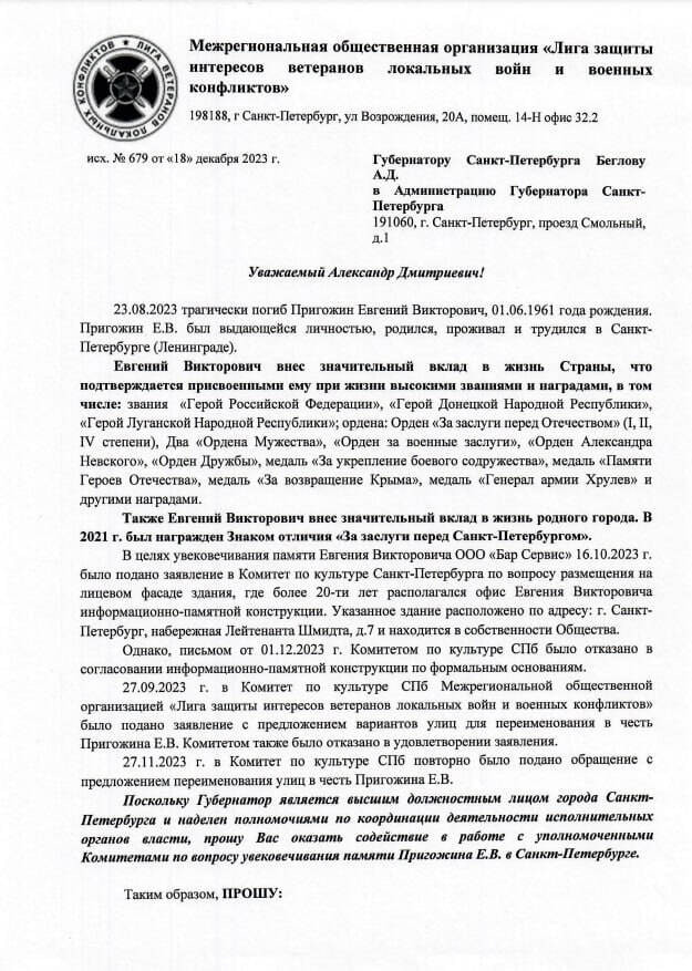 Из обращения общественников следует, что ветераны уже дважды обращались в правительство города с просьбой увековечить память о Евгении Викторовиче, однако каждый раз получали отказ. Так, в сентябре «Лига» просила рассмотреть возможность присвоения имени Пригожина одной из улиц города. В октябре ветераны предлагали установить мемориальную доску на здании на набережной Лейтенанта Шмидта (дом 7), в котором в течение 20 лет располагался офис структур Пригожина.