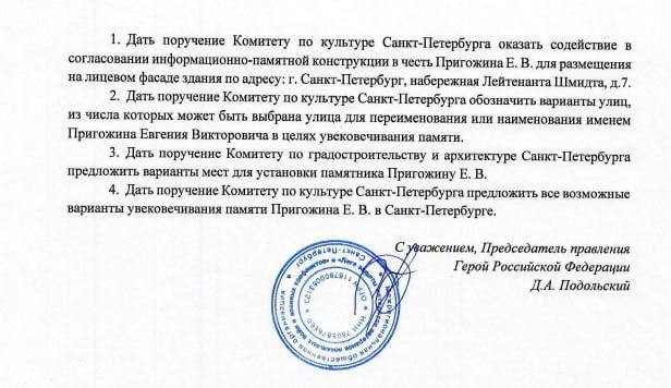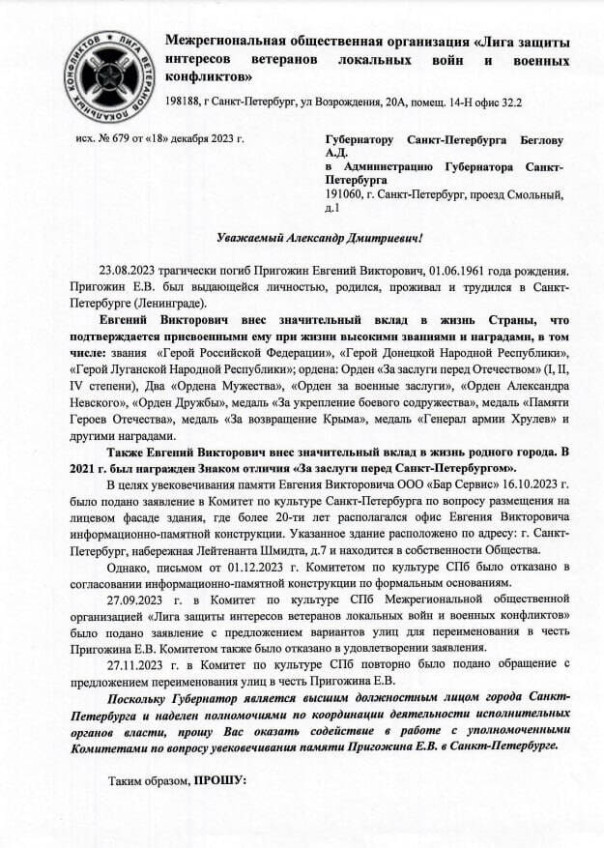 Пресс-служба ЧВК «Вагнер» опубликовала письмо на имя губернатора Санкт-Петербурга Александра Беглова, чтобы совместно с правительством города урегулировать вопрос об увековечивании памяти Евгения Пригожина. Инициировала процесс межрегиональная общественная организация «Лига защиты ветеранов локальных войн и военных конфликтов».