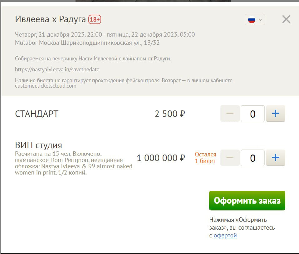 К слову, Ивлеева на этом не остановилась: 21 декабря проводилась ещё одна вечеринка в том же клубе. Цены на неё далеко не ангельские. "Стандартный" билет стоил "всего" 2,5 тысячи, а ВИП-билет обошёлся покупателям аж в миллион рублей. В его стоимость входит бутылка шампанского, некая неизданная обложка с 99 голыми женщинами и студия, рассчитанная на 15 человек.